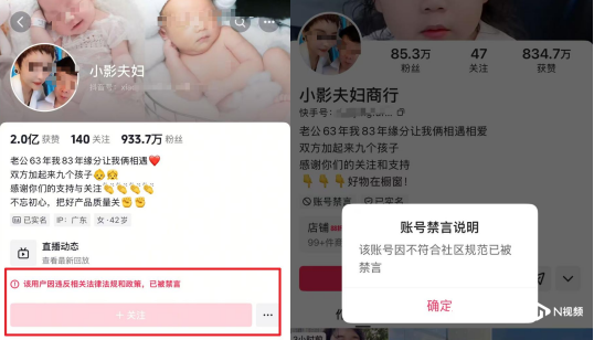据小影夫妇抖音账号主页显示,其账号已无法关注,页面显示“该用户因违反相关法律法规和政策,已被禁言”。另外,快手账号页面也提示“该账号因不符合社区规范已禁言”。